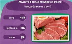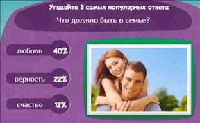 Как уже было сказано ранее, в данной игре на каждом уровне нужно угадывать самые частые ответы людей на различные вопросы. Данных ответов на каждом уровне нужно написать ровно три. Задача не из самых простых, потому можно использовать подсказки - открыть одну букву в одном из угадываемых слов или же убрать лишние буквы при наборе ответа.