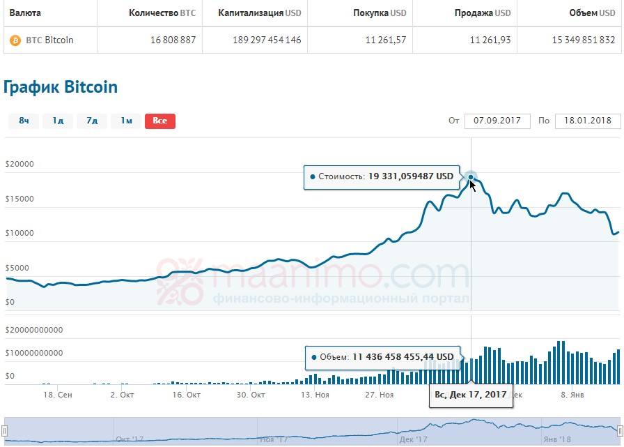 А начал потихоньку падать курс криптовалюты более двух недель назад. Сначала биткоин сбрасывал понемногу, но в последние дни, начиная с 15 января 2018 года обрушение усилилось. Только 16 января текущего года биткоин упал резко до 12000 долларов за монету, а сегодня до 10000 долларов. Но долго на отметке в 10К Bitcoin не продержался и уже сейчас за монету просят около 11000 долларов.
