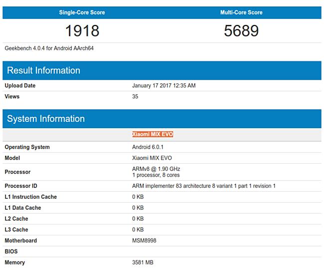 Если говорить о производительности, то в бенчмарке Geekbench смартфон набрал 1918 очков в одноядерном режиме и 5689 баллов в многоядерном. Эти цифры свидетельствуют о том, что разработка Mi Mix Evo подходит к концу и совсем скоро мы все-таки увидим данный девайс. Хотя на скриншоте и отмечено, что Ми Микс Ево тестируется с Андроид 6.0.1 на борту, финальная версия аппарата 100% получит Андроид 7-й версии, так как это флагманское устройство компании.